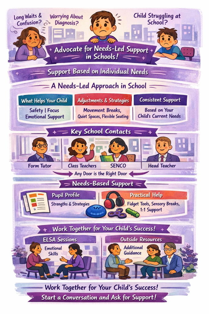 A needs-led approach focuses on how your child experiences school day to day and what helps them feel safe, regulated, and able to learn. This approach allows support to be put in place early, without waiting months or years for assessments. As a parent, you are absolutely entitled to ask for adjustments and support based on your child’s needs alone. You are not asking for “special treatment” — you are advocating for equity.